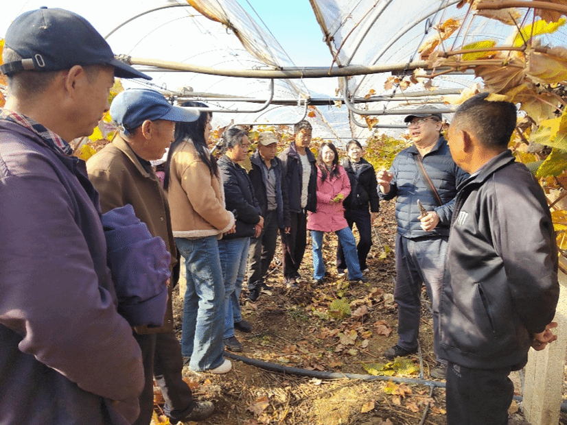 本次培训立足当地葡萄产业发展实际需求,采取“理论讲解+田间实操”的模式,内容兼具专业性与实用性。针对农户提出的霜霉病、白粉病如何防治这一问题,专家教师团队根据自己多年种植经验给农户支招,在掌握好关键节点的基础上用最简单的药如石硫合剂与波尔多液来防治,能较好实现降本提质增效的目的。此外,老师们以通俗易懂的语言系统阐释了品种选育逻辑、作物需肥规律、冬季修剪要领及花期调控原理等方面的知识,逐一拆解这些关键环节的技术参数,并结合典型案例梳理了农户们在种植过程中易入的误区并提出纠正方案,其严谨而贴近实际的讲解获得当地农户们的一致认可。